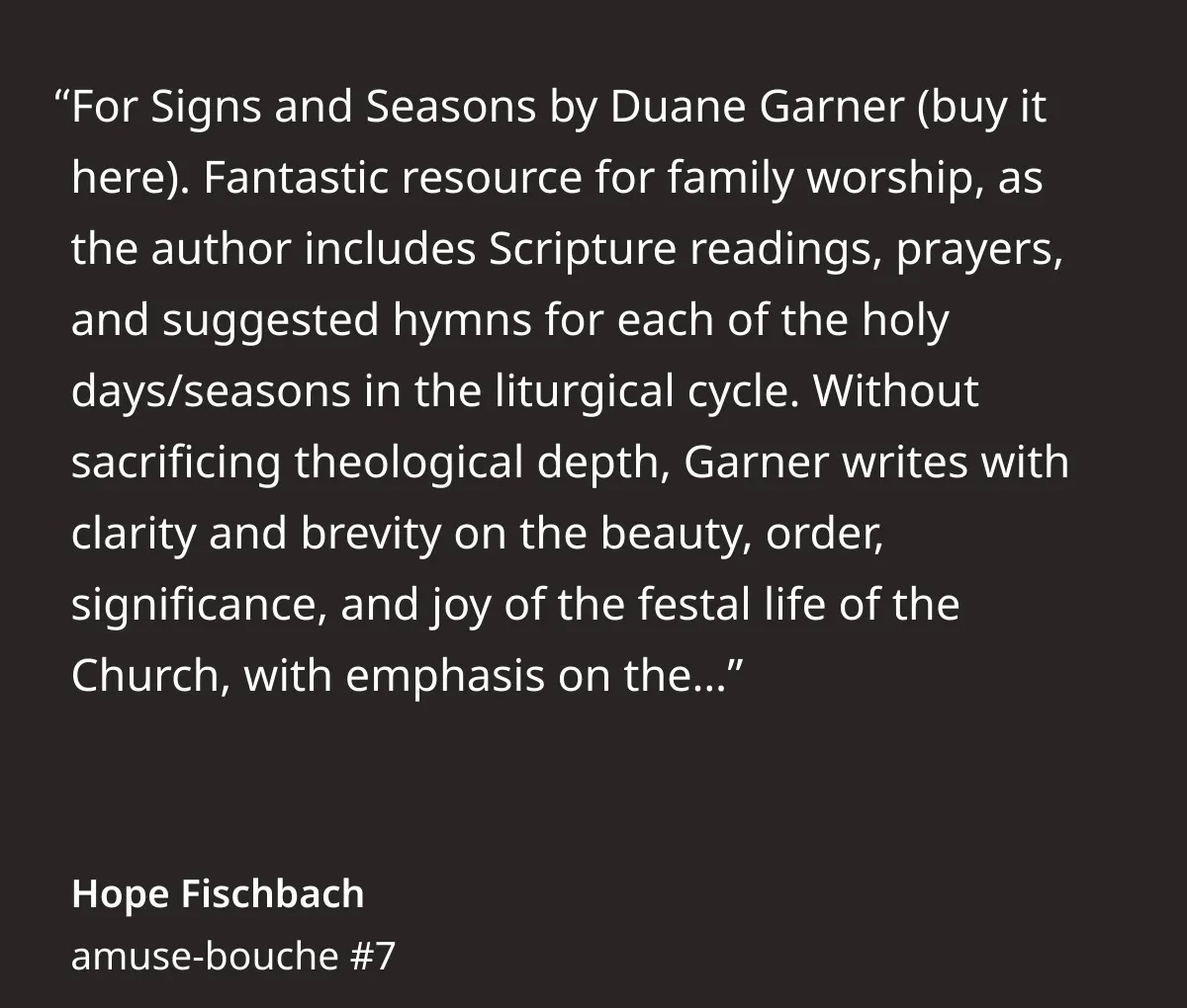 Another great resource that my pastor shared with my congregation is a quick read, For Signs and Seasons by Duane Garner.